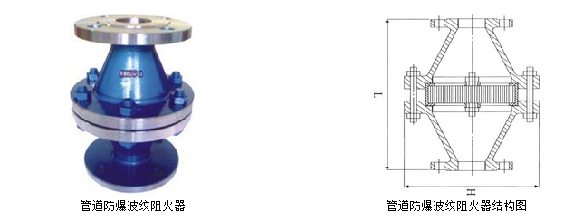 管道防爆波紋阻火器是用來阻止易燃、易爆氣體的火焰蔓延和防止回火而引導起爆炸的安全裝置。管道防爆波紋阻火器適用于可燃氣體管道,如汽油、煤油、輕柴油、苯、甲苯、原油等油品的儲罐或火炬系統,可與呼吸閥配套使用,亦可單獨使用。管道防爆波紋阻火器是利用器壁效應和溫度效應,將火花的活性中心淬滅,以防止火焰繼續蔓延,達到阻火的目的。我公司生產的管道防爆波紋阻火器具有結構緊湊、阻火效果明顯,穩定性強等優點。