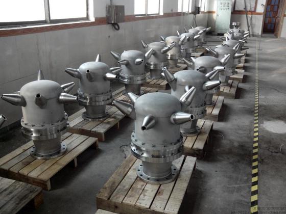 隨位調合旋轉噴頭由噴嘴、集合管、旋轉頭、氣囊、杠桿、法蘭、螺栓等組成,材質為20#、Q235或不銹鋼,旋轉頭為鋁合金或不銹鋼制造。