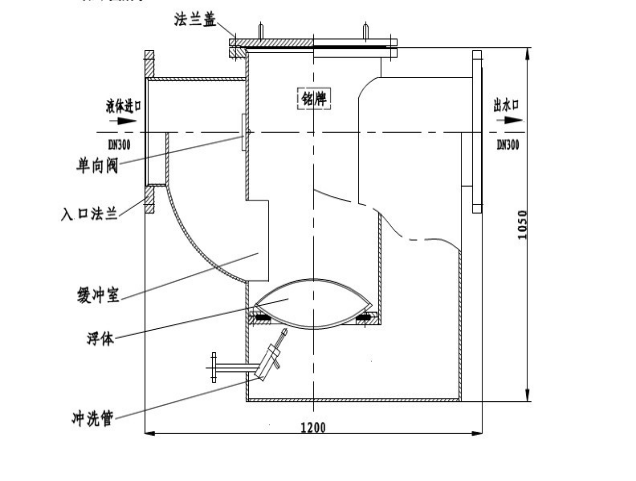 3、 當管道內油水混合時,進水通道、緩沖室與出水通道組成了水封,水從緩沖室下排出,而油從緩沖室上部回流。