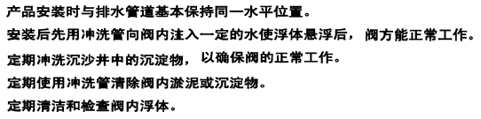 4、 當管道內無介質時,由于裝置內保持一定的水位,裝置內浮體處于常浮狀態,使油品罐區內的水隨時能正常排出。緩沖室內保持一定的水位,一方面是為了保證通道的正常開通,另一方面形成水封使排水通道在閥前后被水隔斷可確保區域安全。